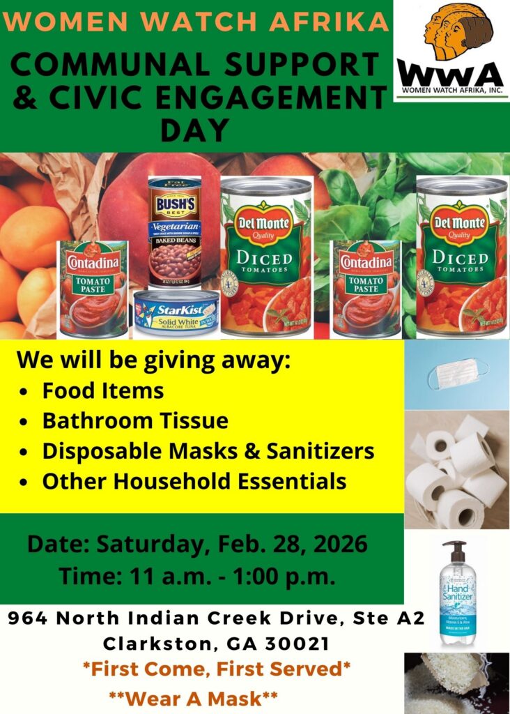 Announcement: See attached flyer (and information below) for Women Watch Afrika’s February Community Support and Civic Engagement Day Women Watch Afrika’s February 2026 Communal Support and Civic Engagement Day: Date: SATURDAY February 28, 2026 Time: 11am – 1pm Where: 964 N Indian Creek Dr, Clarkston, GA What: WWA will give out Food items, […]